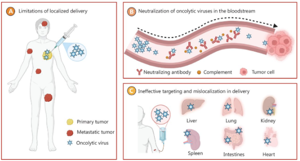 To streamline the delivery of OVTs, and minimise immune-clearance, cell-based and bionanocarrier strategies are being devised. These act as carriers to transport the virus to the target site, and have already had some clinical success. For example, the ONCOTECH delivery system (Peng, et. al 2025), which attaches oncolytic viruses to T-cells, protects OVs from being neutralised by the immune system and improves their tumor-targeting abilities.